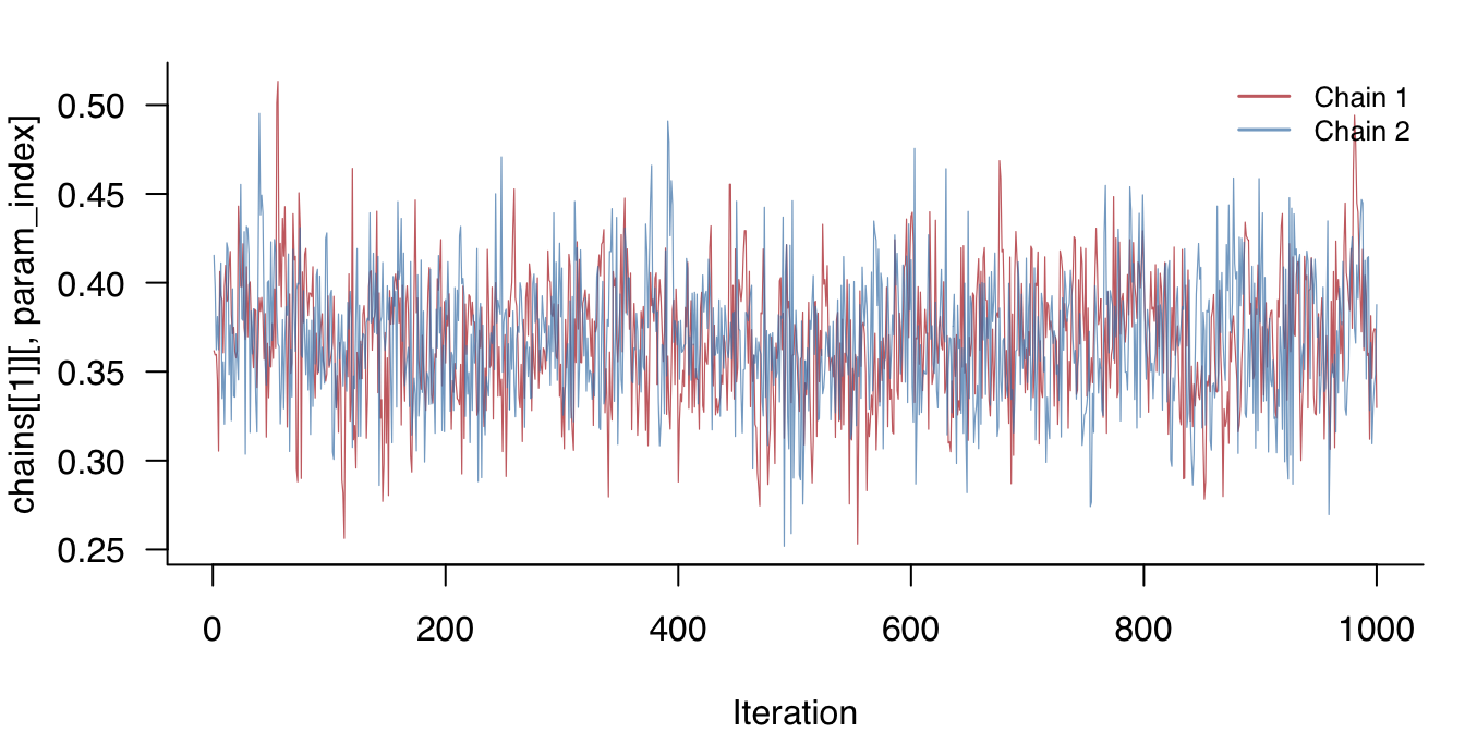 Figure 1: Trace plot for the first pairwise interaction parameter across two chains.